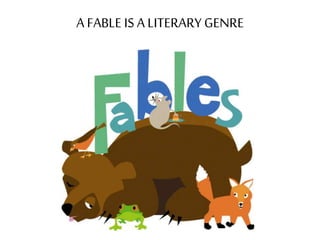 This document discusses fables, a genre of short fictional stories featuring animal characters that act like humans and teach a moral lesson. It notes how Aesop, a Greek author from 500 BC, is famous for creating fables such as "The Tortoise and the Hare." Several of Aesop's fables are listed, and the document indicates that a video of the fable "The Boy Who Cried Wolf" will be shown.