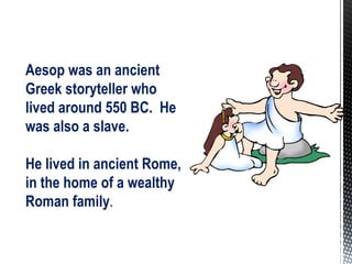 Aesop was an ancient Greek slave who lived in around 550 BC in Rome, where he told fables featuring animal characters to teach moral lessons. His fables became popular and were translated into many languages worldwide over centuries. According to legend, Aesop's master was so pleased with his fables that he granted Aesop his freedom.