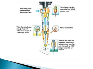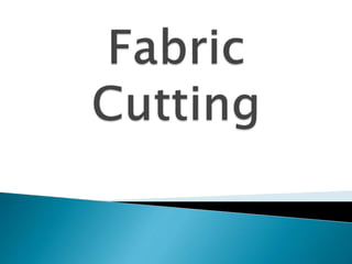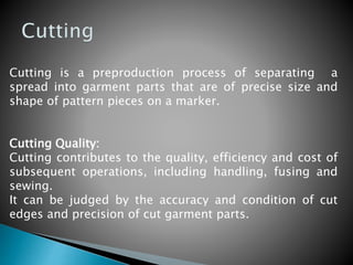 Cutting is the process of separating fabric into precise pattern pieces. Accurate cutting facilitates sewing while inaccurate cutting can cause fitting issues. Factors that influence cutting accuracy include marker lines, cutting technique, pitch, fabric movement, and equipment condition. Cutting is done using hand shears, portable straight/round knives, stationary band knives/dies, or automatic laser/waterjet systems. Proper cutting sets up quality sewing and assembly.