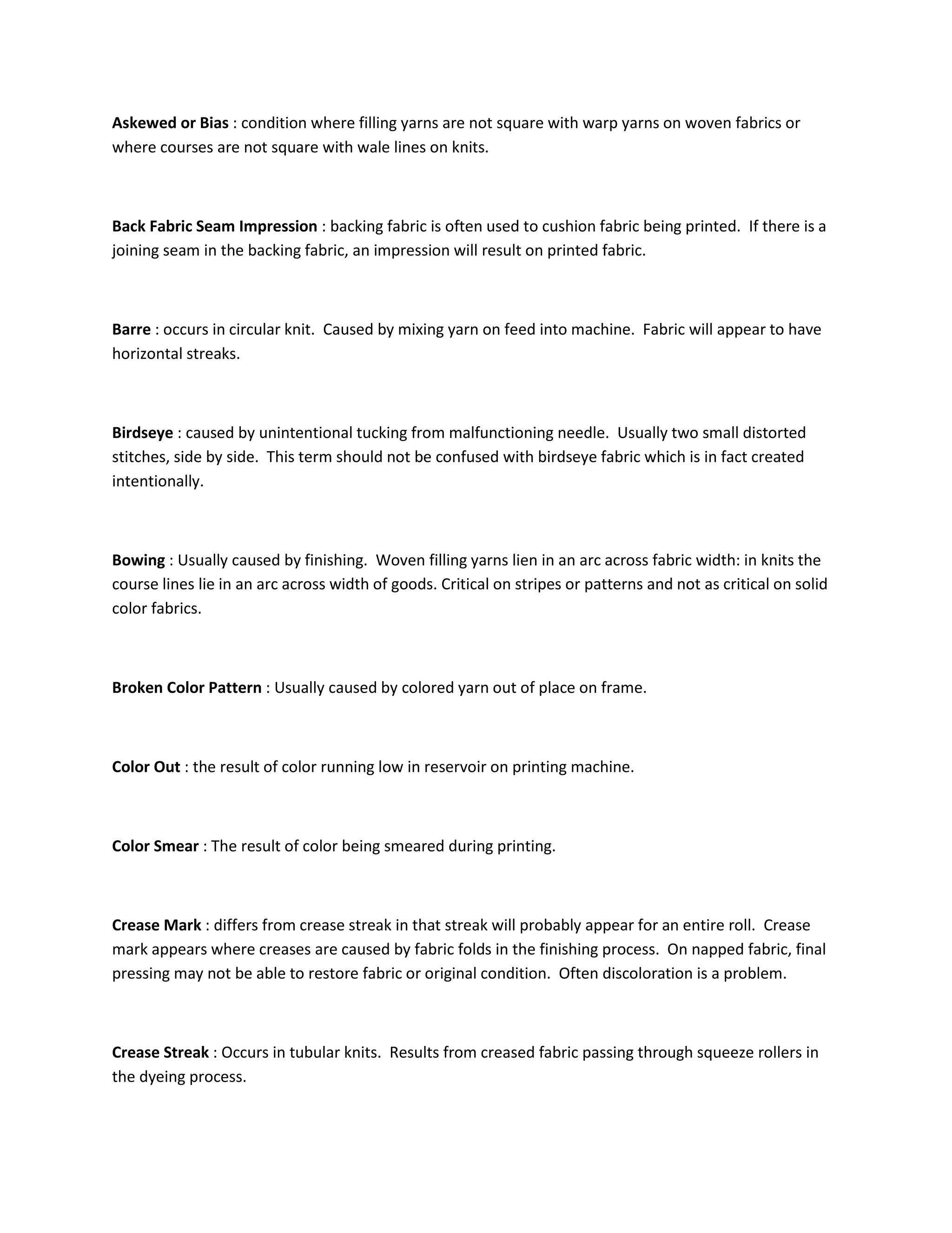 The document defines various types of defects that can occur in woven and knitted fabrics during production, including askewed or bias, back fabric seam impression, barre, birdseye, bowing, broken color pattern, color out, color smear, crease mark, crease streak, drop stitches, dye streak in printing, end out, hole, jerk-in, knots, missing yarn, mixed end, mottled, needle line, open reed, pin holes, press-off, printing machine stop, print out of repair, puckered selvage, runner, sanforize pucker, scrimp, slub, smash, soiled filling or end, stop mark, stray