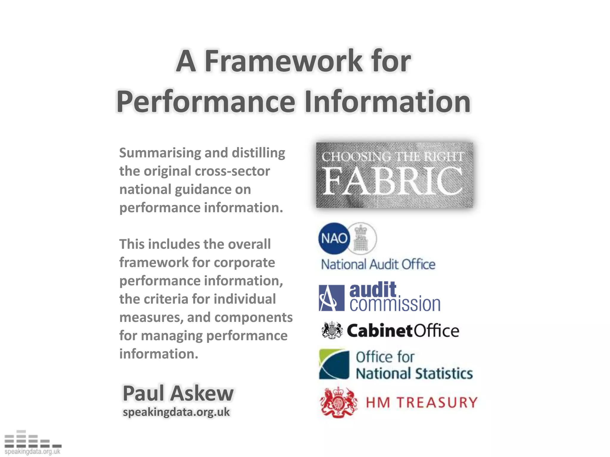 The document outlines a framework for developing an effective corporate performance information system including an overall framework, criteria for individual measures, and components for managing performance information. The framework consists of 6 criteria: focused, integrated, balanced, cost effective, appropriate, and robust. Individual measures should be relevant, attributable, well-defined, reliable, comparable, timely, verifiable, and avoid perverse incentives. Key components include aligning measures with strategic objectives, monitoring results, evaluating performance, and comparing performance over time.