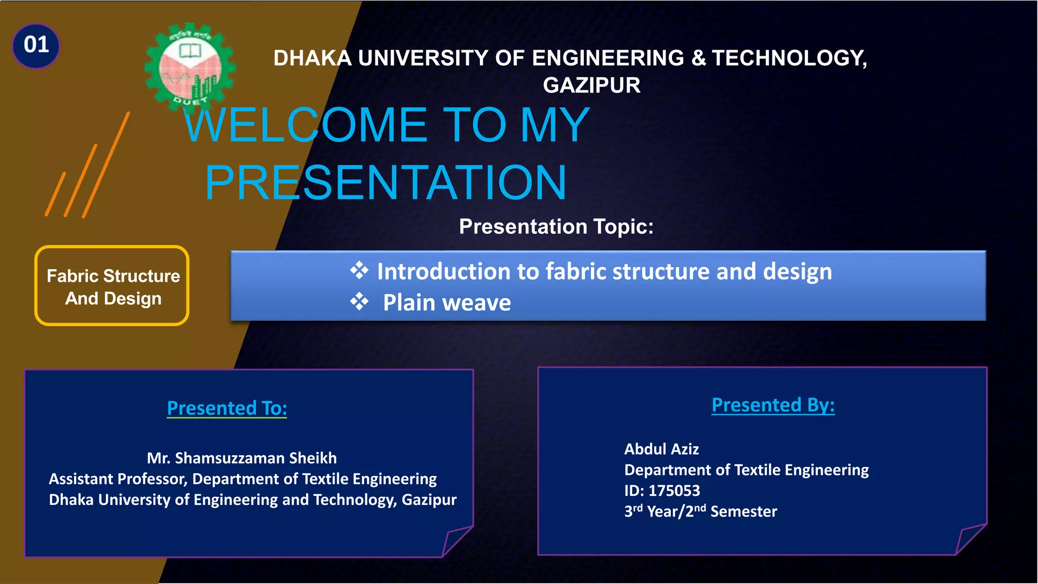 The document presents an overview of fabric structure and design, focusing on the characteristics and classifications of woven fabrics, particularly plain weave. It details various concepts such as warp and weft yarns, grain, interlacing fields, and different types of drafts used in fabric design. Additionally, it describes derivatives of plain weave, including ribbed and matt weaves, along with their advantages and disadvantages.