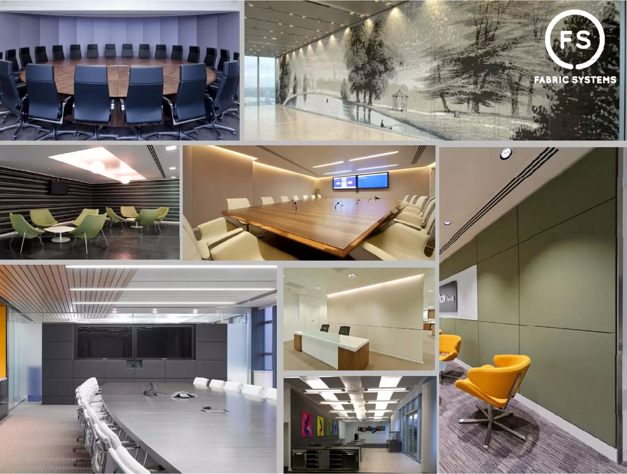 Fabric Systems offers custom fabric wall and ceiling panels for noise control. Their products include stretched fabric walls, demountable acoustic panels, and fabric ceiling baffles. They have a wide range of track components, cores, fabrics, and edge details that allow for fully customized installations. Their standard core material provides acoustic insulation and is made from 100% recyclable materials. They work with various fabric suppliers and can integrate leather or other materials. Their panels are tested to reduce noise across a range of frequencies. Case studies demonstrate installations in office and legal firm buildings.