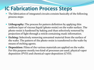 The fabrication process of integrated circuits involves key steps of lithography, etching, and deposition. Lithography uses photo-resist to define patterns on the wafer which are then transferred via etching. Deposition is used to apply thin films of various materials. The fabrication of an NMOS transistor similarly involves patterning via lithography and etching, deposition of thin films like oxide and polysilicon, and doping via diffusion or implantation to form the transistor components in sequence from the substrate up.