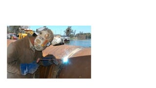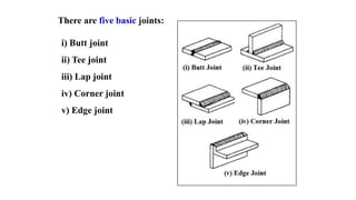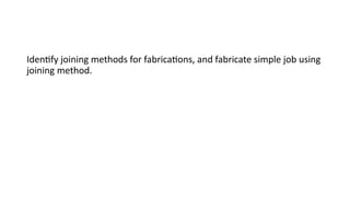 The document discusses various fabrication methods in robotics, particularly emphasizing welding and machining processes. It defines fabrication and contrasts it with manufacturing, highlighting the role of welding in creating permanent joints for various applications. Additionally, it details the machining process for shaping components by removing excess material to achieve desired specifications.