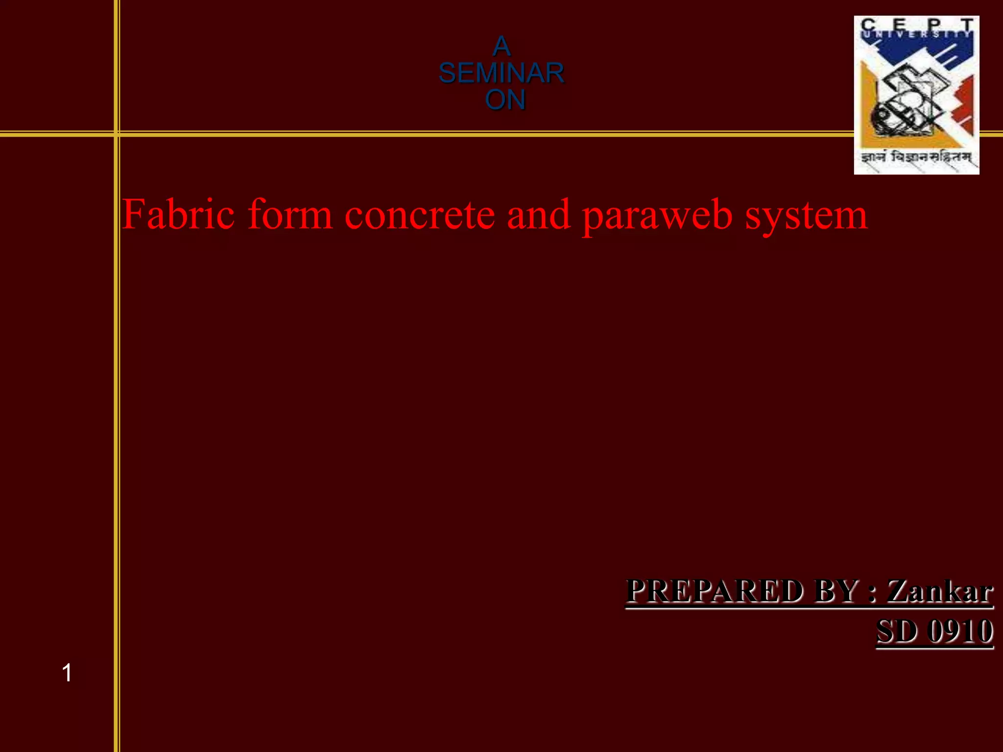 Fabric form concrete involves filling specially woven fabric panels with fine aggregate concrete to create structures that adapt to soil contours during installation. The fabric forms have filtering points that reduce uplift pressures and the chance of system failure. They allow excess water to escape while retaining cement solids, and are chemically inert and hazard-free. Para web soil retention systems use geo-textile fabrics and compacted soil fills for slope stabilization and erosion control.