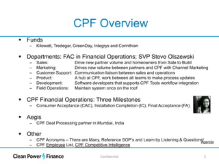 2) CPF has three financial milestones - Consumer Acceptance, Installation Completion, and Final Acceptance.