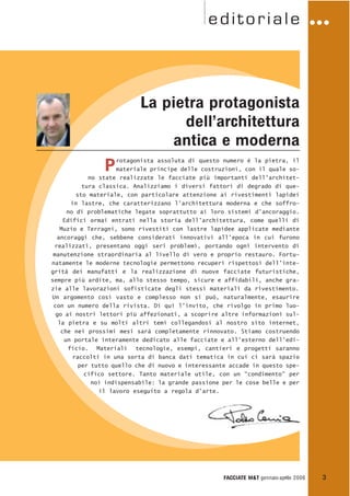 Il documento analizza i fattori di deterioramento della pietra naturale nelle facciate degli edifici, evidenziando l'inquinamento atmosferico e gli errati interventi costruttivi come cause principali del degrado. Si discutono anche le moderne tecnologie di restauro e l'importanza di un corretto intervento di manutenzione per preservare l'integrità dei materiali. Infine, viene presentato un progetto di recupero del Palazzo dell'Informazione, evidenziando le fasi di intervento e la necessità di una maggiore attenzione alla conservazione delle facciate.