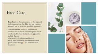 The document discusses face care cosmeceuticals, emphasizing their importance for maintaining youthful skin through various products and techniques like cleansers, exfoliators, and treatments. The global market for facial care has seen growth, with rising consumer awareness and a shift towards men’s grooming, leading to the projection of significant growth in the Indian market. Future trends include a focus on eco-friendly products, custom skincare solutions, and the integration of beauty with health care.