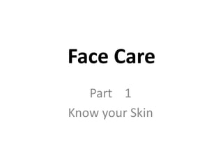 This document provides information about different types of face care. It discusses different skin types including oily, dry, combination, and sensitive skin. It then describes various face wash products categorized by their main ingredients such as papaya, gold, neem and tulsi, sandalwood and almond, and blueberry and red berry. Finally, it briefly discusses cleansers, moisturizers, and fairness creams as part of a basic skincare routine.