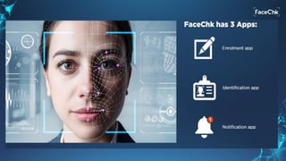 The document discusses an AI-enabled face recognition system called 'Facechk,' which is designed for identity and access management, particularly in the context of minimizing physical contact due to the COVID-19 pandemic. It highlights the advantages of facial recognition over traditional fingerprint systems, such as touch-free operation, speed, and ease of deployment across various devices. Additionally, Facechk offers features for attendance management, visitor management, and other applications while ensuring hygiene and facilitating social distancing.