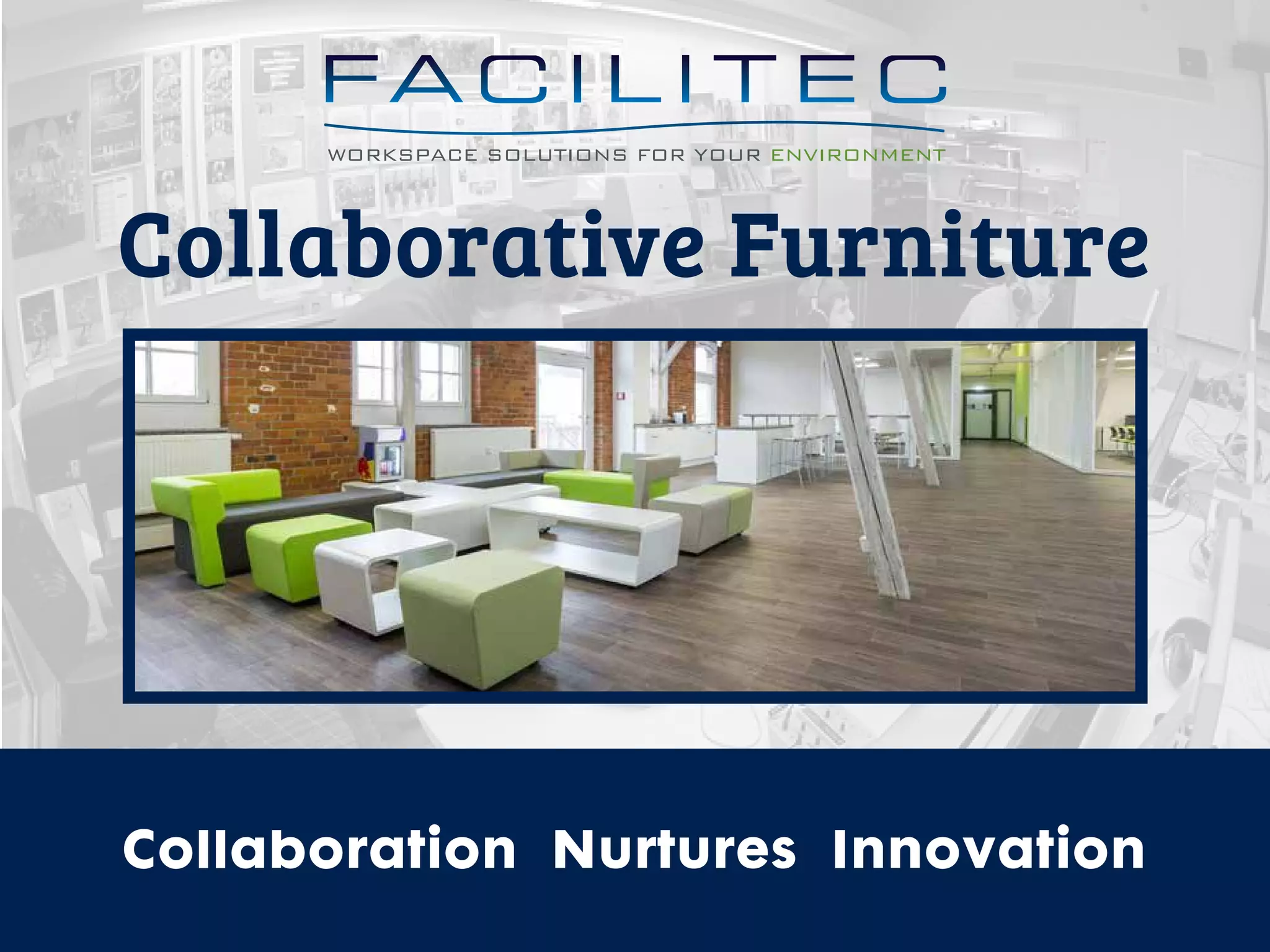 The document discusses the evolution of collaborative work environments driven by social media and highlights types of collaboration including team and community collaboration. It emphasizes the importance of trust, communication, and common goals for successful partnerships, while showcasing various collaborative furniture options that enhance productivity. Additionally, it outlines different workspace configurations that facilitate collaboration among employees.