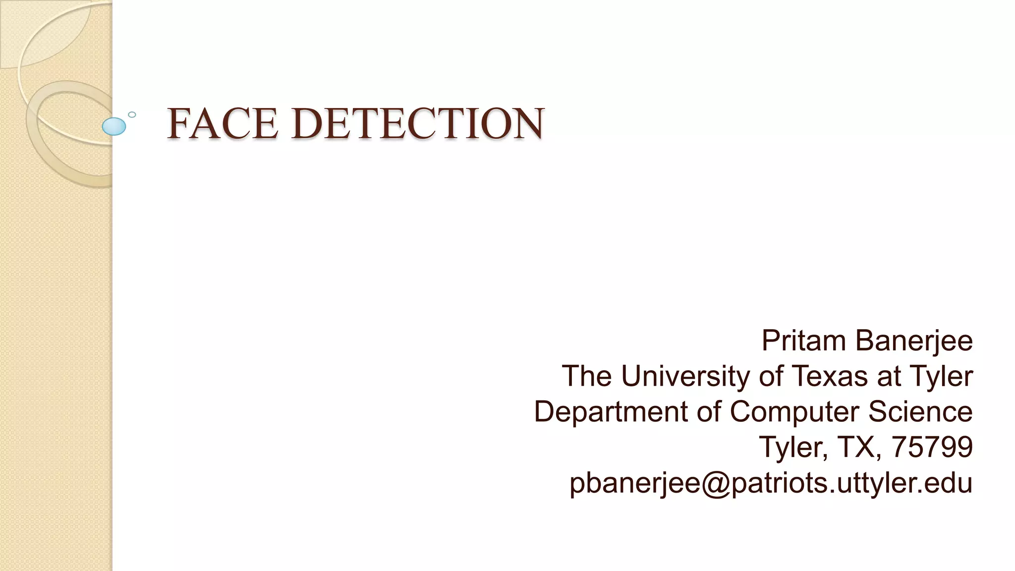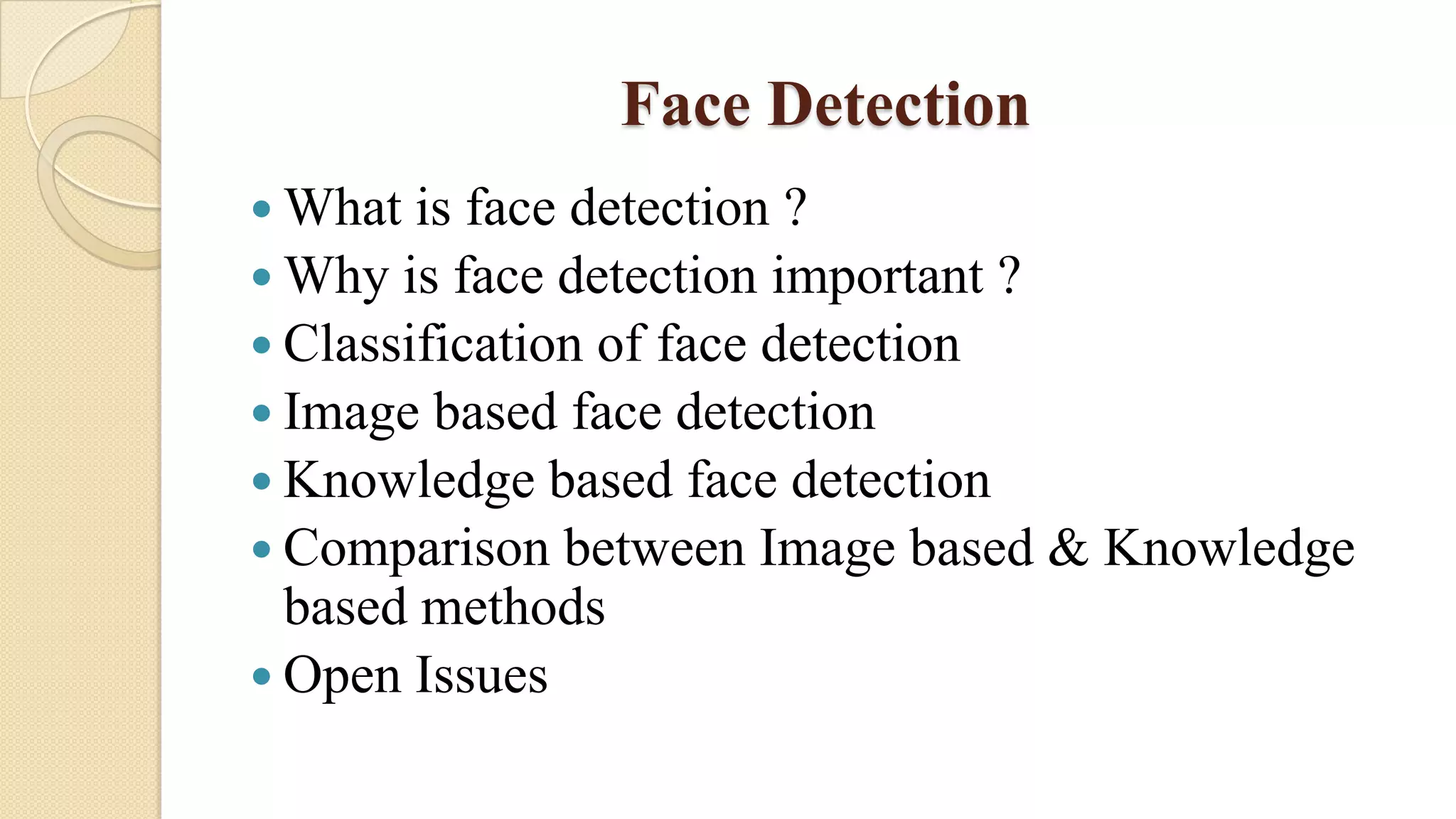 This document discusses face detection techniques. It defines face detection as identifying regions in images that contain faces. Face detection is important for applications like security, video retrieval, and human-computer interfaces. The document categorizes face detection methods as either image-based, which use training to compare faces to non-faces, or knowledge-based, which detect facial features like skin, eyes and mouths. It provides examples of techniques within each category and notes that image-based methods are more complex while knowledge-based techniques are usually faster. The document concludes by outlining some open issues in face detection.