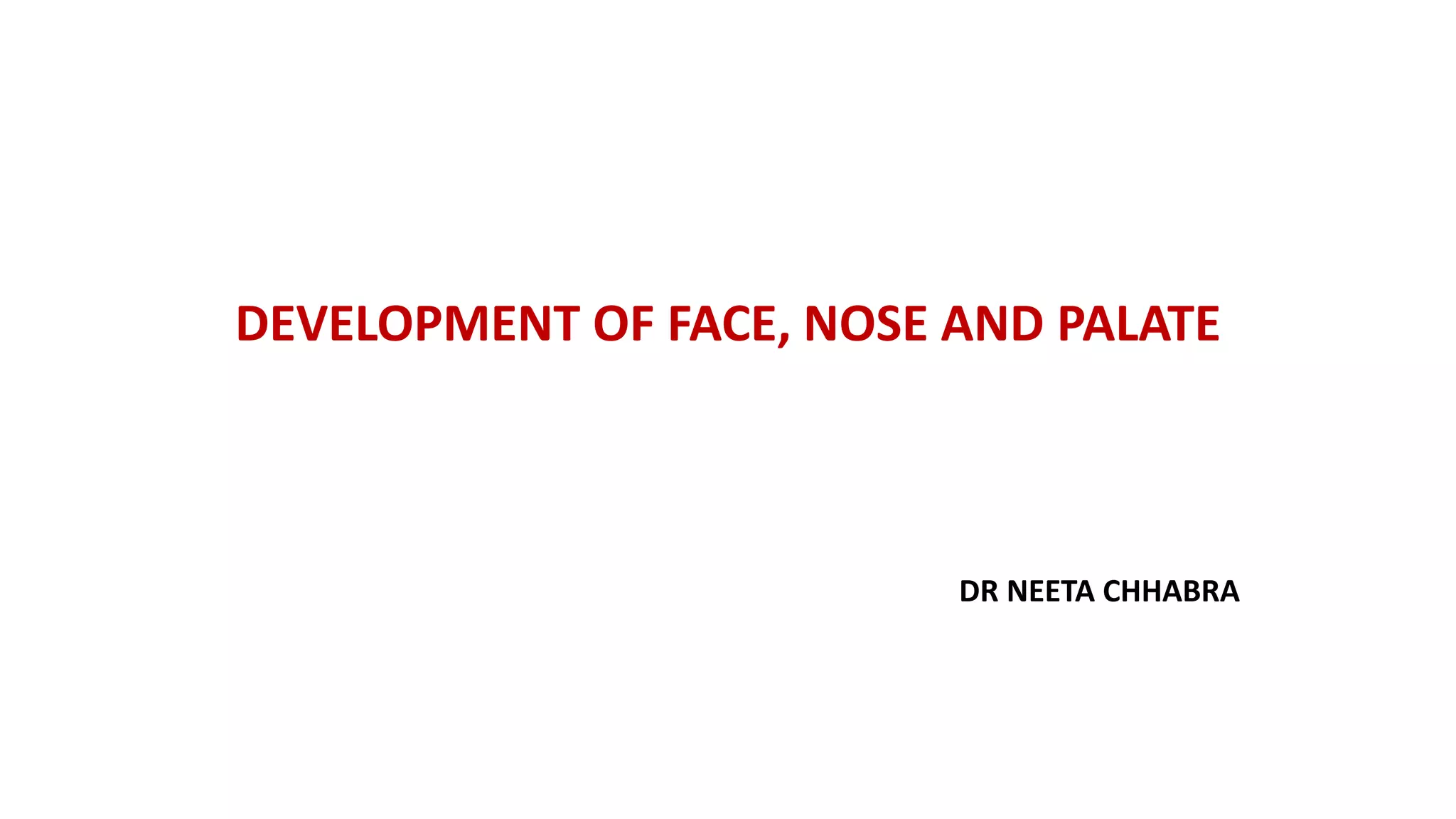 The document discusses the development of the face, nose, and palate between 4-12 weeks of gestation. It summarizes that: