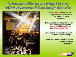 The document announces a promotion by local television stations myFox10 and WTHI-TV to find the "Face of Fox" through a talent search and viewer voting. Winning the title will earn someone a one-year paid contract as spokesperson for the stations' events and promotions. Businesses can sponsor the search and benefit from branding opportunities, including spots advertising their support during the competition and appearances by the winner. Larger sponsorship packages offer more promotional elements and visibility.