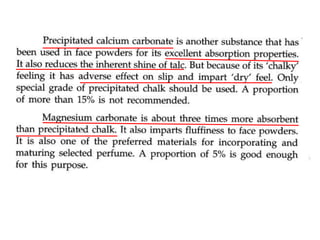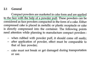 This document discusses face powders, including their ideal properties, ingredients, manufacturing processes, and evaluation. It covers both loose and compact face powders. Key points include: