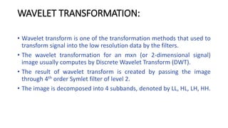 The document presents a major project on face recognition using Discrete Wavelet Transform (DWT) and Principal Component Analysis (PCA) at the University College of Engineering, Rajasthan Technical University. It outlines the algorithms for image processing, highlighting the use of wavelet transformation to reduce image size and PCA to extract features for recognition, ultimately calculating the Euclidean distance between test and training images for identification. Additionally, it details the steps for database generation and testing with a focus on the use of wavelet and PCA techniques.