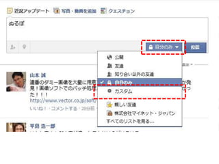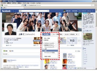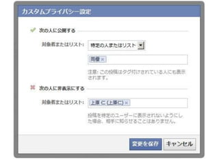 「X年Y月Z日の合コンで知り合った人」 – 「○○株式会社」 – 「ナントカ勉強会で会った人」 • 投稿の共有範囲の設定に使う – 「同僚」 – 「取引先」 – 「大学の友人」