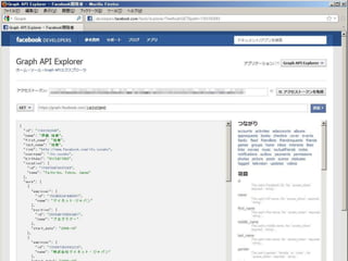 facebookの実装仕様はとってもシンプル – Graph API Explorerを使いこなそう – 基本を押さえるだけで技術仕様書要らず • 使い方編 – 知らなかったで済まされる機能は結構沢山あ る – facebookページへの「いいね!」は重い