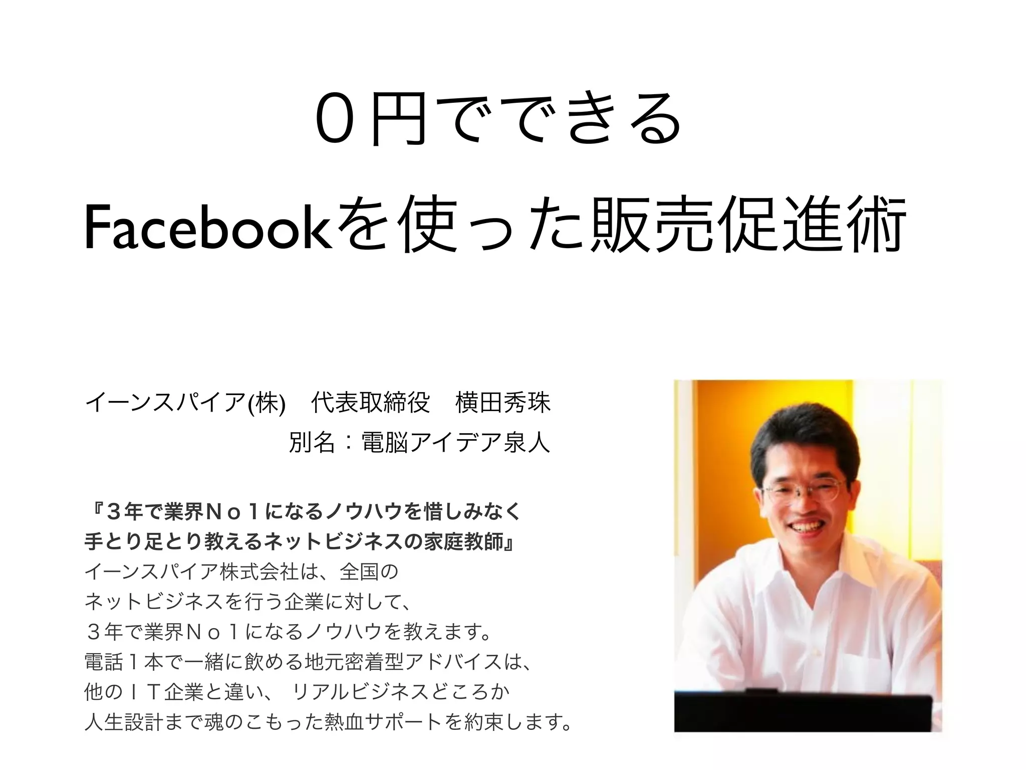 Facebookを使った販促は ネットビジネスではなく リアルビジネスである。 イーンスパイア(株) 横田秀珠の著作権を尊重しつつ、是非ノウハウはシェアして行きましょう。