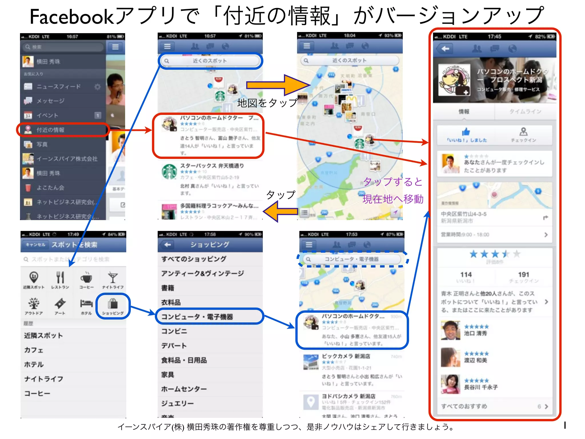 地図をタップ タップすると タップ 現在地へ移動 イーンスパイア(株) 横田秀珠の著作権を尊重しつつ、是非ノウハウはシェアして行きましょう。 1