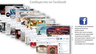 Документ представляет собой анализ 10 сообществ на Facebook с общим охватом более 4,5 миллионов уникальных пользователей в месяц и 500 тысяч подписчиков. Включает статистику по подписчикам, возрастному составу, охвату в России и Украине, а также возможности рекламного размещения и проведения специальных проектов. Подробно описаны ключевые показатели и демографические характеристики каждой группы, что показывает разнообразие целевой аудитории.