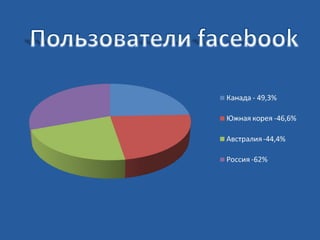 Документ описывает социальные сети, выделяя их функции и возможности, такие как создание профиля, обмен сообщениями и групповые чаты. Он акцентирует внимание на преимуществе Facebook, включая доступ к широкой аудитории и интерактивный контент, а также упоминает о проблемах, таких как реклама и неудобный интерфейс. Статистические данные о пользователях Facebook подчеркивают его популярность и активность.
