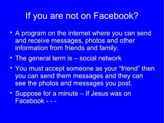 The document explores the hypothetical scenario of Jesus being on Facebook, posing questions about friendship, communication, and the sharing of messages. It emphasizes the importance of accepting Jesus as a friend, reading and sharing his teachings, and remaining faithful to him. It challenges readers to consider their relationship with Jesus in the context of modern social networking.