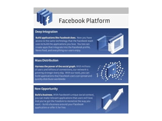 The document appears to be about Facebook and its features. It discusses how Facebook allows users to connect with old friends, meet new people through features like poking and sending messages. It also mentions that Facebook gives users tools to control their privacy and information sharing. The document notes that since 2007 over 23,000 applications have been created for Facebook and it now has over 700 million active users.