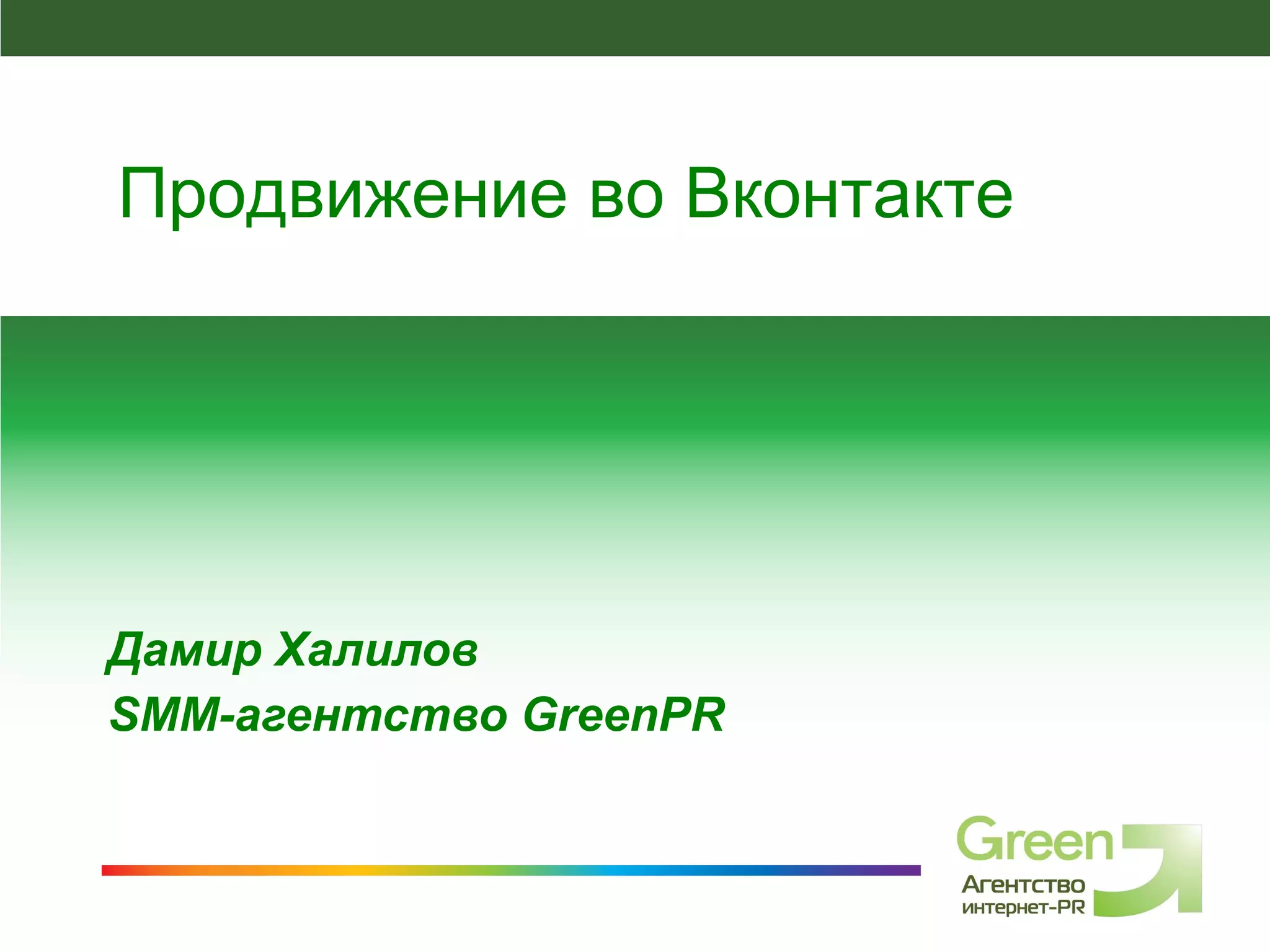Документ описывает SMM-агентство GreenPR, его акцент на продвижении в социальной сети ВКонтакте, которая занимает первое место в Европе по популярности. Упоминается значительное количество пользователей и блогов на русском языке, а также различные приложения, включая встроенные интернет-магазины. Основной акцент делается на брендах, ассортименте и интересах, а также на способах вовлечения аудитории.