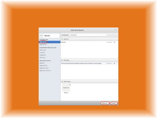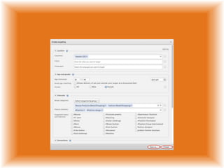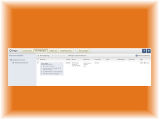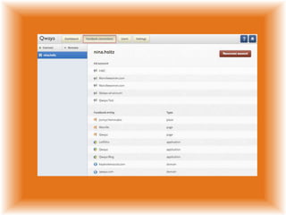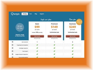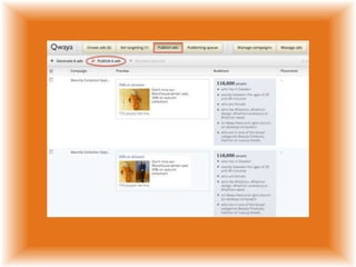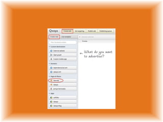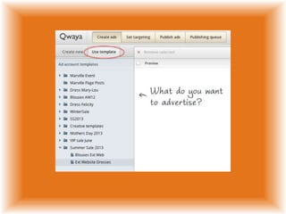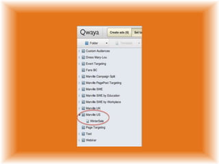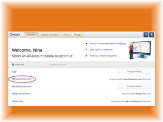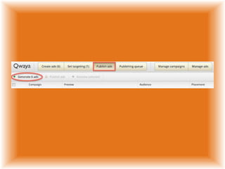 Qwaya is a tool for managing Facebook ad campaigns that allows users to create, publish, track, optimize and organize various Facebook ad types through a more sophisticated and usable interface than Facebook's native tools. It provides templates for ad creatives and targeting that enable users to reuse high performing ads and targeting strategies. The dashboard displays connected Facebook accounts and campaigns. Users can create campaigns by developing ad creatives and targeting templates, setting budgets and bids, and publishing ads to Facebook through Qwaya.