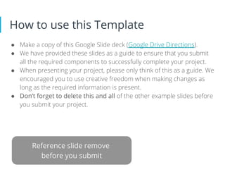 This document provides instructions for using a Google Slides template to submit a marketing project. It explains that the template should be copied, used as a guide to ensure all required components are included, and that example slides should be deleted before submitting. Students are encouraged to be creative as long as required information is presented.