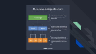 This document is a guide on how to start advertising on Facebook, outlining key steps such as setting up a Facebook page and business manager account, using Facebook Pixel for tracking, and defining a campaign structure. It discusses creating ad sets, targeting various audiences, and optimizing ads based on data analysis. The aim is to help users effectively utilize Facebook ads to drive traffic and improve engagement with their products or services.
