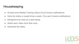 The document provides an overview of Facebook Ads Manager, including training resources, key features like performance columns, ad creation methods, and troubleshooting ad delivery. It outlines various advertising objectives categorized into awareness, consideration, and conversion, and emphasizes the importance of automated rules for managing ad performance. Additionally, it discusses campaign organization using tags and split testing audiences.