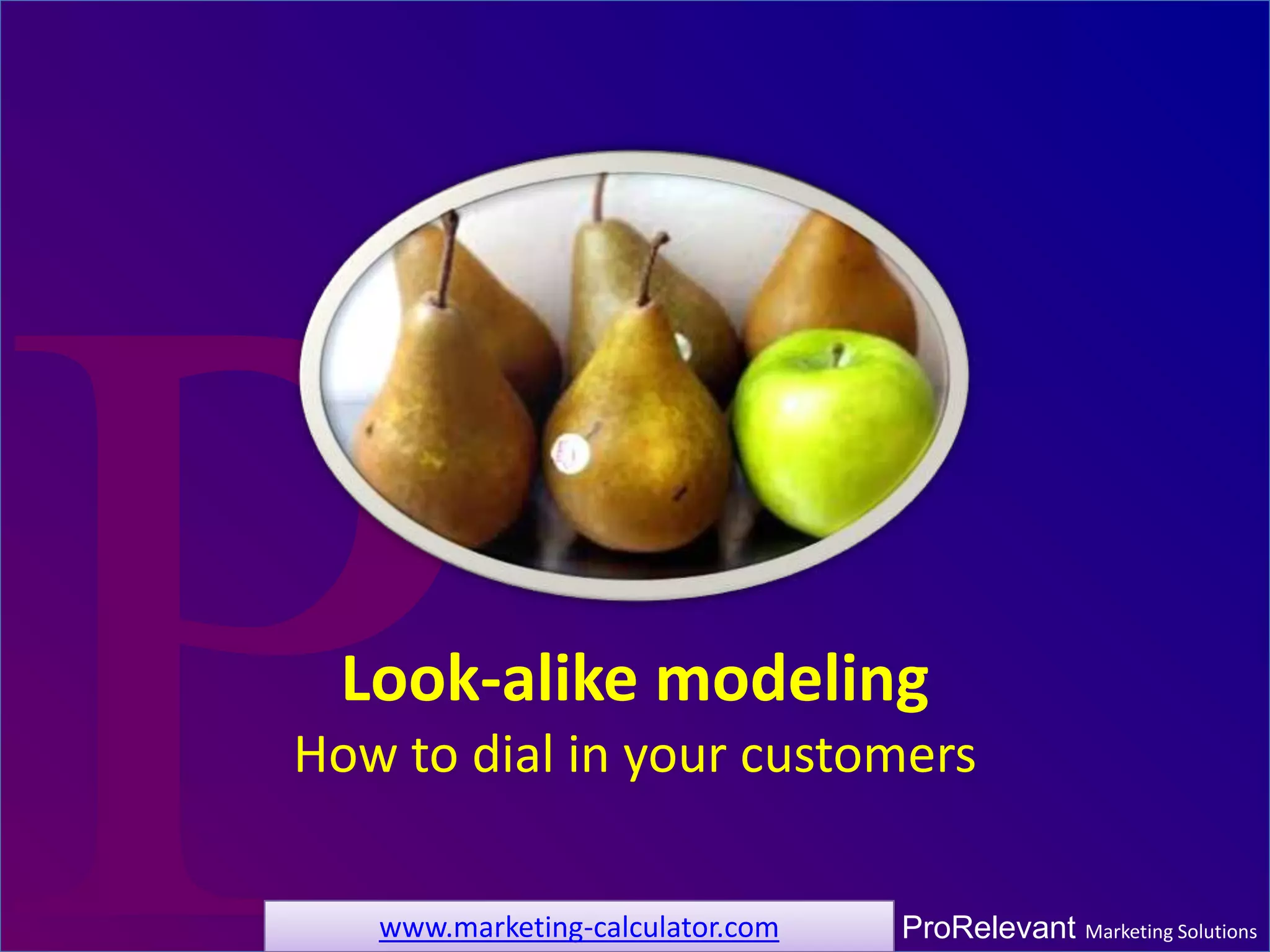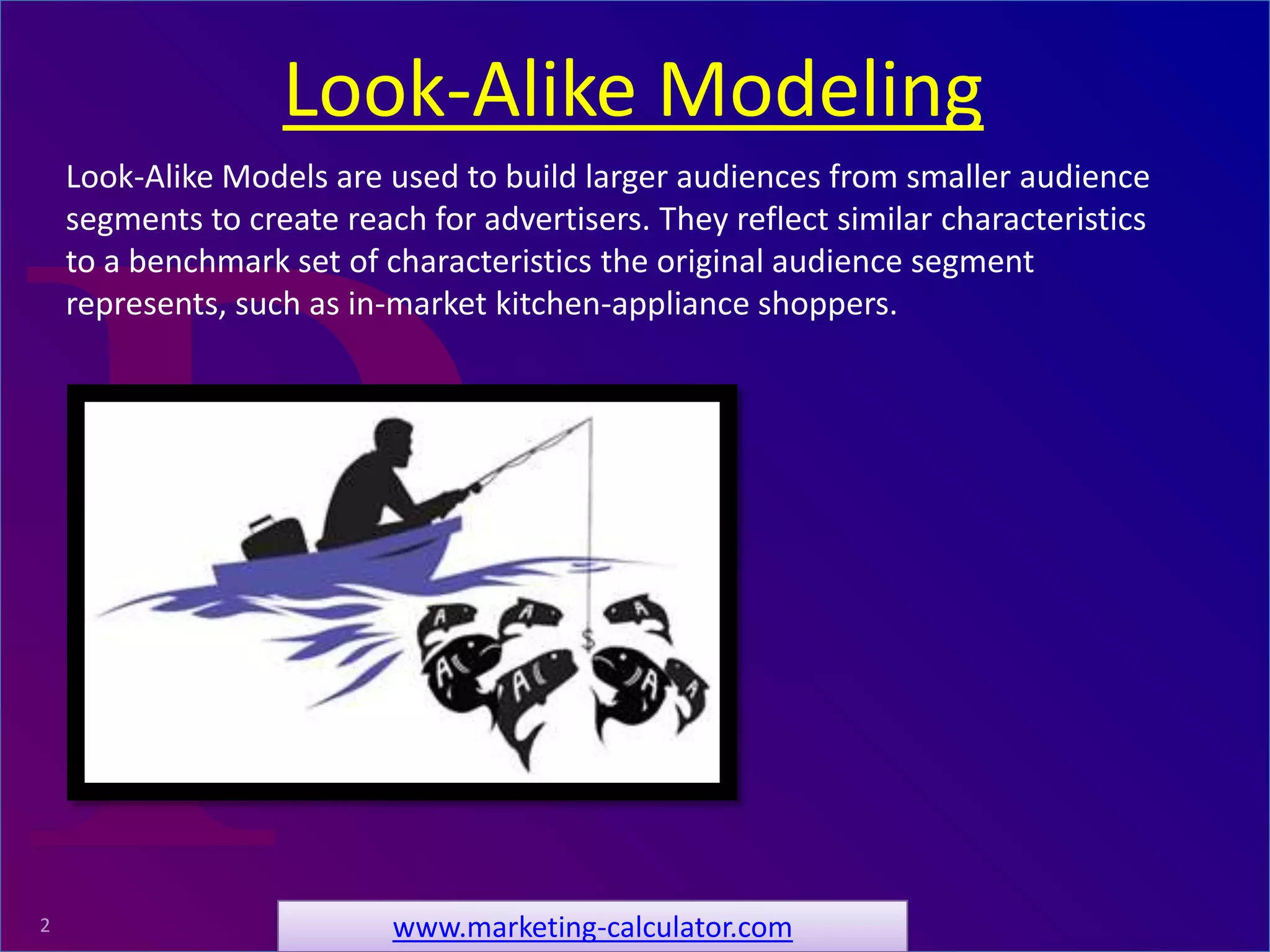 Look-alike modeling is a marketing strategy used to expand advertiser reach by identifying larger audience segments that share characteristics with a target group. This document discusses demographic segmentation, indexed purchase likelihood, cost, and return on marketing investment (ROMI) associated with different audience segments. It concludes that while targeting smaller, more defined segments can improve marketing effectiveness, it may also incur higher costs, necessitating a balance between cost and effectiveness.