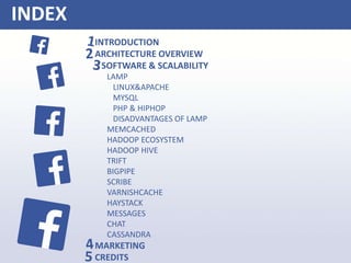 The document details Facebook's architecture and technology stack, including its use of LAMP (Linux, Apache, MySQL, PHP) and custom solutions like HipHop, Hadoop, and Cassandra to manage scalability and performance challenges. It highlights the extensive infrastructure, including 300,000 servers and various caching systems, that supports Facebook's data management and real-time processing needs. Additionally, it discusses Facebook's marketing strategies and the importance of engaging users through personalized content and targeted advertisements.