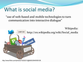 This document discusses the use of social media among student midwives. It provides definitions of social media and references guidelines from the NMC. A survey found that 100% of students use Facebook, with 76% finding it useful for communicating with colleagues and 67% finding it useful for midwifery education. While there are risks like breaches of confidentiality, social media can provide educational and networking benefits if used carefully. The document argues that social media should not be avoided but embraced as a tool for professional discussion and support, as long as confidentiality is maintained.