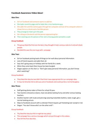 The document discusses three ideas for an awareness video about being careful who you add on Facebook. The first idea, of a girl adding a seemingly nice man who turns out to be unpleasant, was liked the best by the group for its serious tone. The second idea, about posting personal information online and then having one's home burgled, was not felt to directly link to adding unknown people on Facebook. The third idea, using humorously dressed teachers in Facebook profile pictures, was felt to be too jokey for the campaign's serious message.