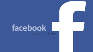 The document analyzes the impact of Facebook, presenting both advantages and disadvantages. It highlights statistics about user engagement and discusses its role in social networking, personal growth, and information sharing, while also addressing privacy concerns and potential psychological effects on teenagers. Ultimately, it suggests that whether Facebook is a boon or bane depends on individual usage and perspective.