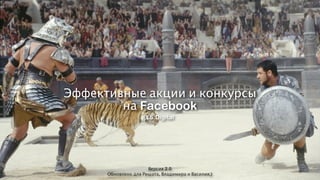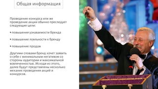 Документ описывает эффективные стратегии проведения акций и конкурсов на платформе Facebook для повышения узнаваемости бренда, лояльности клиентов и увеличения продаж. Важные аспекты включают соблюдение законодательства России, механики взаимодействия с участниками и методы вовлечения аудитории. Также предоставляются рекомендации по оформлению конкурсов и дополнительные предложения по сотрудничеству.