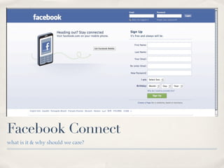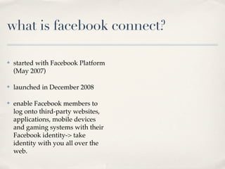 Facebook Connect is a service that allows users to log into third-party websites and applications using their Facebook identity, bringing their identity and social connections with them. It provides trusted authentication, uses a user's real identity, allows access to their Facebook friends, and offers dynamic privacy controls. Facebook Connect is important because it gives Facebook influence over advertising on other sites and allows the exchange of people's social interactions for access to new ideas, representing a change in the way social connections are formed online.