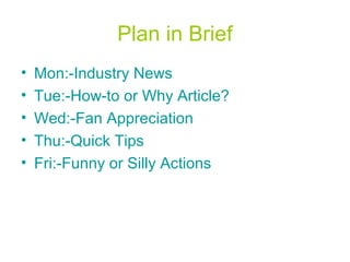 This document outlines a weekly content calendar for Facebook posts. It includes posting industry news on Mondays, how-to articles on Tuesdays, fan appreciation on Wednesdays, quick tips on Thursdays, and funny or silly content on Fridays. Each day also includes responding to comments from the previous day's post and engaging with fans through questions, photos, polls, or discussions. The goal is to consistently share varied content and interact with followers throughout each week.