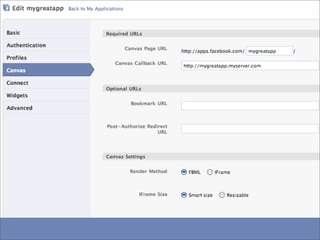 - Applications have a Canvas page where content is embedded and a Callback URL to retrieve content from the developer's server.