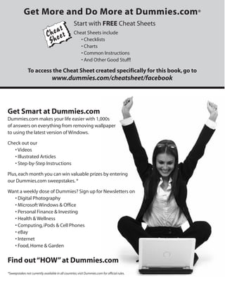 This document is an excerpt from the book "Facebook For Dummies, 2nd Edition" which provides an overview of Facebook and teaches readers how to use it. The document explains what Facebook is, what you can do on the site like creating a profile, connecting with friends, sharing photos and videos. It also outlines some of Facebook's key features like News Feed, friend lists, and privacy settings. The excerpt concludes by promoting other Dummies books and resources for readers to learn more skills.