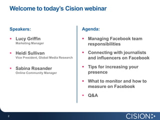 This document summarizes a Cision webinar on using Facebook for PR professionals. The webinar covered managing Facebook team responsibilities, connecting with journalists and influencers on Facebook, managing customer services, increasing presence and engagement on Facebook, and monitoring and measuring engagement on Facebook. Speakers included Heidi Sullivan, Lucy Griffin, and Sabina Rosander from Cision who provided tips and examples from brands like Tesco and EA Sports. Attendees could submit questions during the webinar.