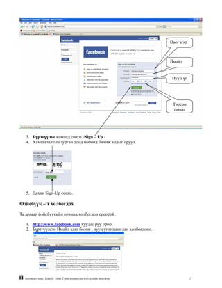 Ймайл Нууц үг Төрсөн огноо 3. Бүртгүүлье команд сонго. /Sign – Up / 4. Хамгаалалтын зурган доод мөрөнд бичиж кодыг оруул. 5. Дахин Sign-Up сонго. Фэйсбүүк – т холбогдох Та аргаар фэйсбүүкийн орчинд холбогдон ороорой. 1. http://www.facebook.com хуудас руу орно. 2. Бүртгүүлсэн Ймайл хаяг болон , нууц үгээ ашиглан холбогдоно. Боловсруулсан: Туяа.М /АМСТ-ийн номын сан-мэдээллийн менежер/ 2