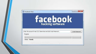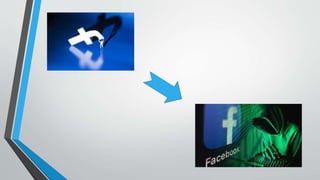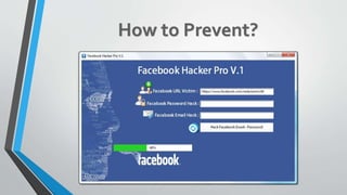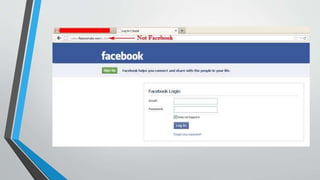 The document highlights various fake and spoofed websites imitating Facebook, warning users to think before clicking. It discusses methods used to hack Facebook passwords, particularly focusing on password reset techniques and keyloggers. Additionally, it mentions the existence of hacking software targeting Facebook accounts.