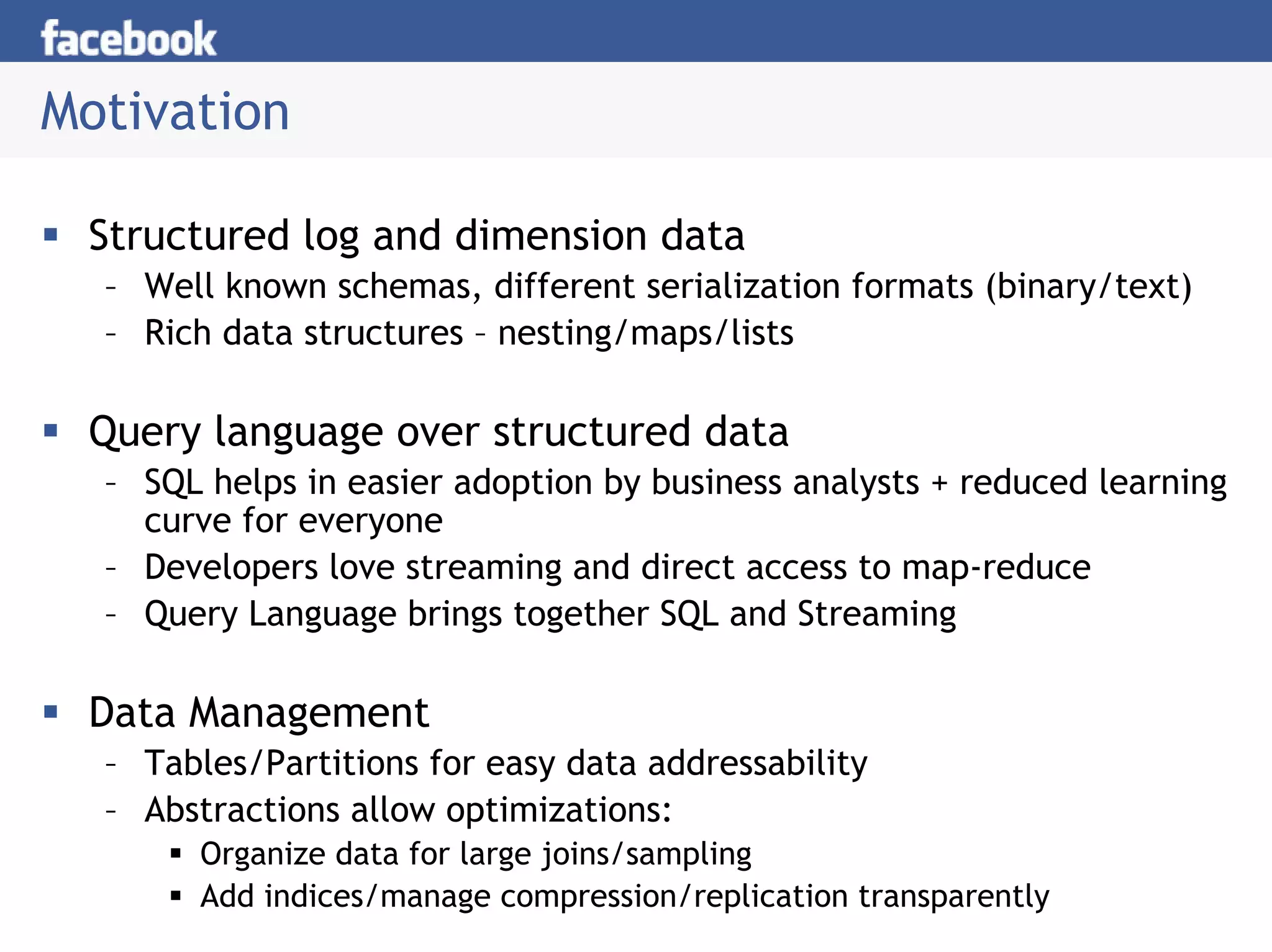 Hive provides a mechanism for easy data warehousing of structured data stored in Hadoop. It uses a SQL-like query language that allows business analysts to query this data more easily. It stores metadata about tables and partitions in a metastore. The query language supports operations like projections, joins, grouping, and applying streaming operators to the results. Hive is used at Facebook for data summarization, ad hoc analysis, and assembling training data.