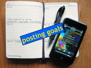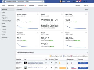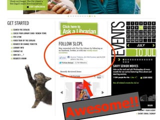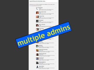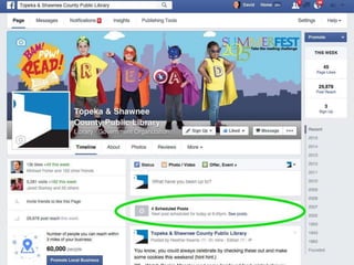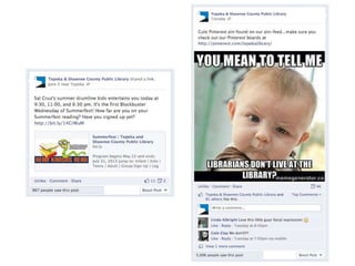 The document discusses using Facebook and social media to engage library users. It emphasizes the importance of mixing marketing, IT, and librarians' input. It provides tips for creating compelling content through visual and human posts that tell the library's story. The last section encourages audience participation by asking questions and calls to action. The overall message is rebooting the library's social media approach to better engage with its community.