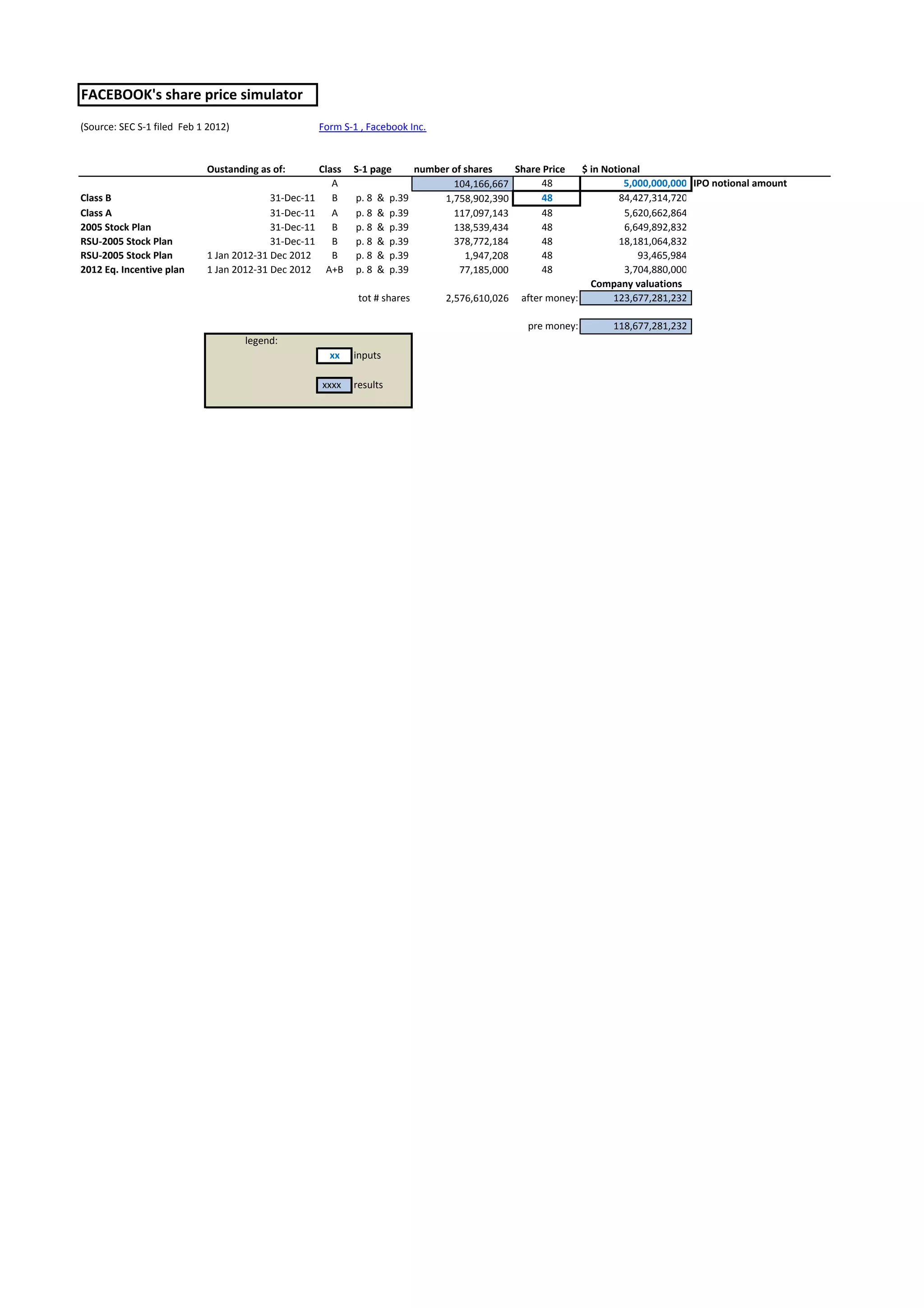 This document contains a share price simulator for Facebook using data from their S-1 filing with the SEC from February 2012. It shows the number of outstanding shares for different classes of stock as of December 2011 and projected for 2012, and calculates the implied valuation of Facebook at different hypothetical share prices. At a $48 per share price, the pre-money valuation would be $118.7 billion and the post-money valuation after the IPO would be $123.7 billion.